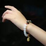 This image showcases the Hetian Jade Amber Dzi Bead Ethnic Bracelet, a distinctive piece featuring milky white Hetian jade beads, a traditional dzi bead, a red agate accent, and a translucent amber money bag pendant. Worn on a wrist against a dark backdrop, the bracelet blends the smooth luster of jade with the cultural significance of the dzi bead and the symbolic amber charm. It exudes (Oriental charm) and ethnic elegance, making it an ideal accessory for those seeking a unique, culture-inspired jewelry piece that combines traditional craftsmanship with auspicious symbolism.