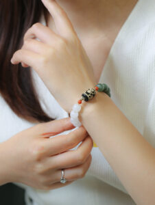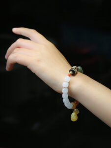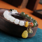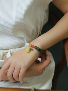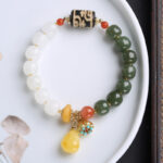 This close-up emphasizes the Hetian Jade Amber Dzi Bead Ethnic Bracelet’s traditional dzi bead, flanked by red agate and gold accents. The detail highlights the unique patterns of the dzi bead and its cultural significance, connecting the bracelet to ancient ethnic traditions and craftsmanship.
