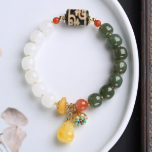 Worn on a wrist, this Hetian Jade Amber Dzi Bead Ethnic Bracelet highlights its comfortable fit and layered design. The mix of jade beads, the dzi bead, and the amber charm adds a touch of sophistication, ideal for elevating both casual and formal outfits with ethnic-inspired grace.