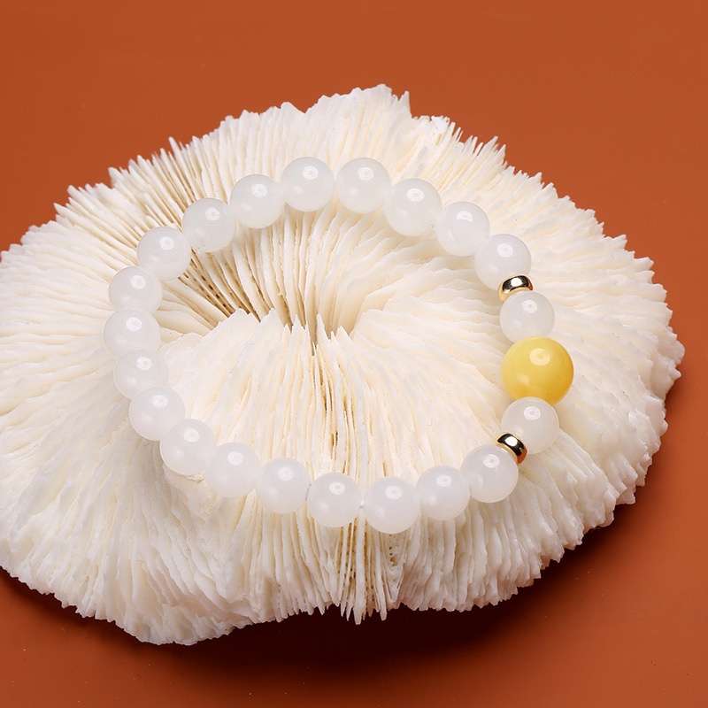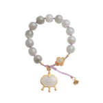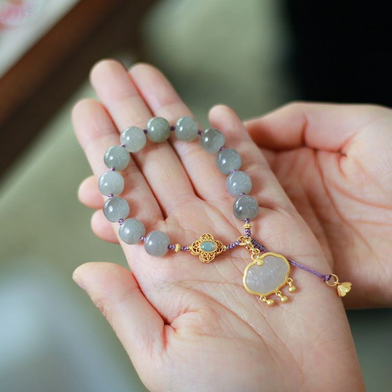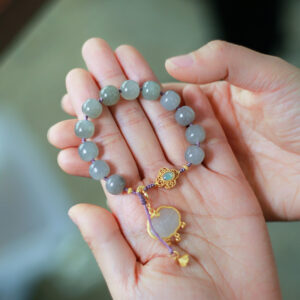 Held in hands, this Smoky Purple Hetian Jade Lock Charm Bracelet showcases its full design: the uniform smoky jade beads, the ornate gold charm, and the symbolic jade lock pendant. The display emphasizes the bracelet’s balance of natural beauty and traditional craftsmanship, making it a standout piece.