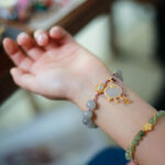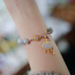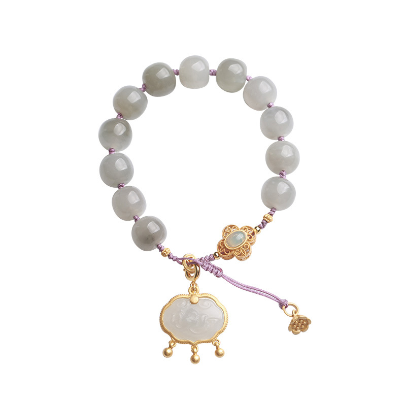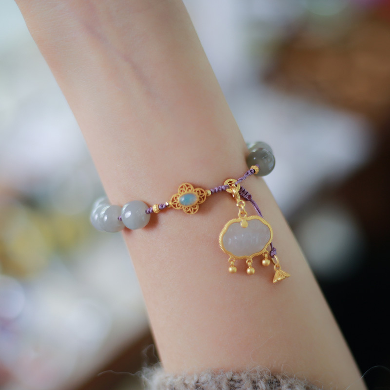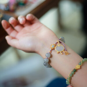 This image showcases the Smoky Purple Hetian Jade Lock Charm Bracelet, a delicate piece featuring smoky purple Hetian jade beads, intricate gold-toned charms, and a central jade lock pendant with dangling gold beads. Worn on a wrist, the bracelet blends the soft translucency of jade with the ornate details of the gold accents, exuding (light luxury) elegance and cultural symbolism. It’s an ideal accessory for those seeking a refined, tradition-inspired jewelry piece.