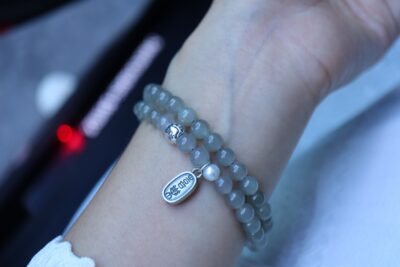 A close-up of the Smoky Purple Hetian Jade “Peace Joy” Multi-Wrap Bracelet highlights the “Peace Joy” silver charm, the pearl accent, and the uniformity of the smoky jade beads. This detail showcases the precision of the silverwork, the luster of the pearl, and the smoothness of the jade, underscoring the bracelet’s artisanal quality and cultural depth.