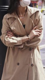 This image showcases the Matte Agate Chalcedony Minimalist Necklace, a stylish piece featuring matte black agate beads and a central white chalcedony accent. Worn with a chic trench coat, the necklace adds a touch of understated luxury to the outfit. Its minimalist design and the contrast between the black agate and white chalcedony make it a versatile accessory, perfect for elevating both casual and formal looks. The necklace embodies a blend of modern simplicity and natural elegance, ideal for those seeking a dainty yet impactful jewelry piece.