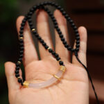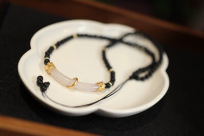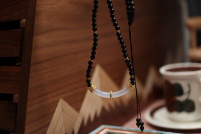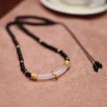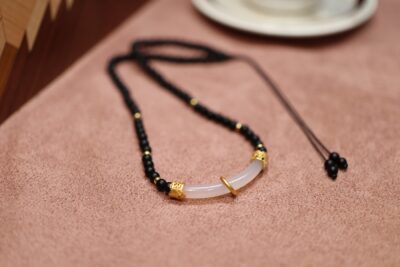 Placed on a soft, textured surface, the Matte Agate Chalcedony Minimalist Necklace showcases its full design: the uniform black agate beads, the elegant chalcedony curve, and the adjustable cord. This setting highlights the necklace’s balance of natural materials and meticulous design, making it a standout piece.