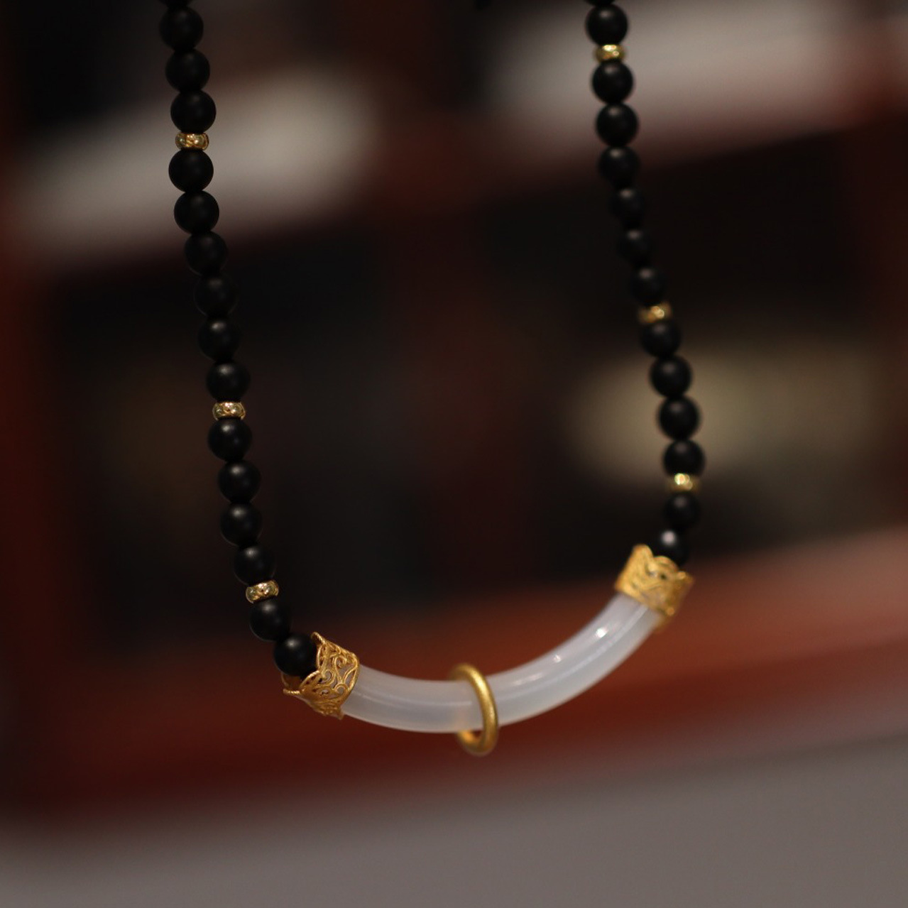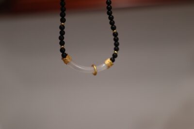 This close-up emphasizes the Matte Agate Chalcedony Minimalist Necklace’s matte black agate beads and gold accents. The detail highlights the uniformity of the agate, the subtle sheen of the gold, and the delicate filigree work, connecting the necklace to both modern minimalism and traditional jewelry artistry.