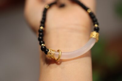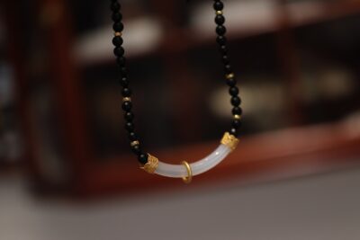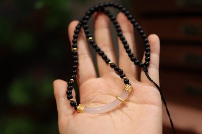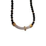 This image showcases the Matte Agate Chalcedony Minimalist Necklace, a distinctive piece featuring matte black agate beads and a central translucent chalcedony curved pendant, accented with intricate gold-toned filigree details. Held in a hand, the necklace highlights the contrast between the deep black agate, the soft translucency of chalcedony, and the opulence of gold, creating a look that’s both modern and rooted in traditional craftsmanship.