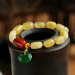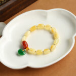 Worn on a wrist, the Amber Jade Ruyi Lock Multi-Gem Bracelet showcases its comfortable fit and eye-catching design. The combination of natural amber, red agate, and green jade creates a look that’s both culturally significant and fashion-forward, ideal for those seeking a meaningful and stylish jewelry piece.
