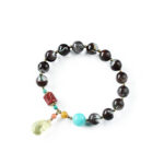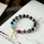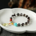 Worn on a wrist, the Multi-Gem Phantom Quartz Amber Fortune Bracelet showcases its comfortable fit and eye-catching design. The combination of phantom quartz, turquoise, red agate, and amber creates a look that’s both culturally significant and fashion-forward, ideal for those seeking a meaningful and stylish jewelry piece.