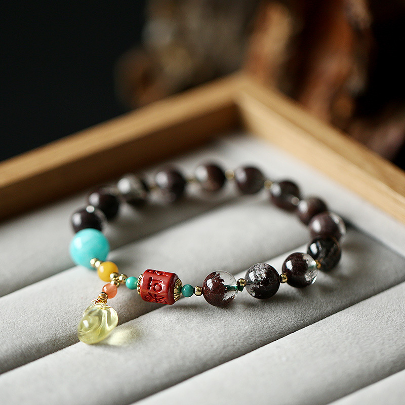 Placed in a plush, gray jewelry tray, the Multi-Gem Phantom Quartz Amber Fortune Bracelet exudes a sense of luxury and refinement. The phantom quartz beads’ unique inclusions, the turquoise’s vivid hue, the red agate’s intricate engravings, and the amber pendant’s delicate carving are showcased in detail, reflecting the piece’s handmade artistry and attention to quality.