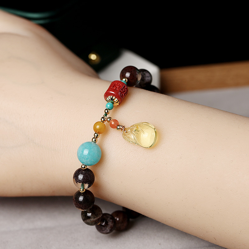 This image showcases the Multi-Gem Phantom Quartz Amber Fortune Bracelet, a unique piece featuring phantom quartz beads, a vibrant turquoise accent, a red agate charm with auspicious engravings, and a natural amber money bag pendant. Set against an elegant paper backdrop with subtle calligraphy, the bracelet blends mystical phantom quartz with symbolic elements like the amber money bag (representing wealth and prosperity) and the engraved agate (symbolizing good fortune). The combination of natural gemstones and thoughtful design makes it a meaningful accessory.