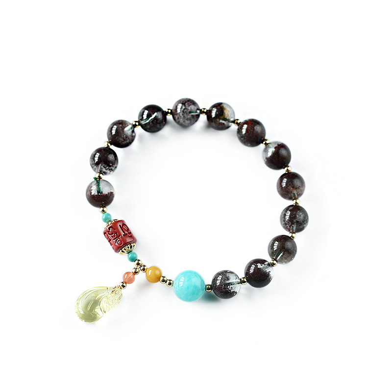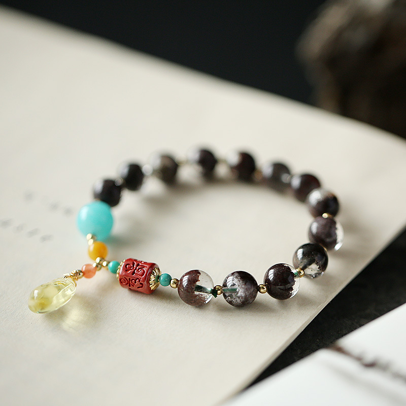 This image showcases the Multi-Gem Phantom Quartz Amber Fortune Bracelet, a unique piece featuring phantom quartz beads, a vibrant turquoise accent, a red agate charm with auspicious engravings, and a natural amber money bag pendant. Set against an elegant paper backdrop with subtle calligraphy, the bracelet blends mystical phantom quartz with symbolic elements like the amber money bag (representing wealth and prosperity) and the engraved agate (symbolizing good fortune). The combination of natural gemstones and thoughtful design makes it a meaningful accessory for those seeking a blend of spiritual significance, cultural symbolism, and artistic craftsmanship.