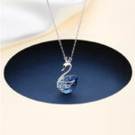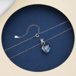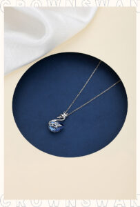 This image showcases the Crown Swan Necklace, a piece that blends elegance and whimsy. The pendant features a swan adorned with a delicate crown, its body crafted from a vibrant blue, faceted crystal that catches the light beautifully. Suspended from a fine silver chain, the necklace is presented against a contrasting dark blue circular backdrop, with a soft, light-colored fabric accent adding a touch of sophistication. The text “CROWN SWAN NECKLACE” and  highlight the design’s regal and graceful theme, making it a perfect accessory for those who appreciate jewelry that combines fairy-tale charm with modern sparkle.