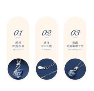 Titled “PRODUCT DETAILS” , this image focuses on the necklace’s crystal element. The text  (Premium Crystal) notes: “Adopts high-quality crystal inlay design, dazzling and charming, carefully lighting up the beauty of the neck.” The close-up view emphasizes the crystal’s cut, clarity, and the way it interacts with light, underscoring the piece’s luxurious appeal.
