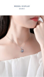 A model wears the necklace, showcasing its elegance on the collarbone. Paired with a white off-shoulder top, the pendant’s intricate design and blue crystal complement the skin tone, making it suitable for both casual and formal occasions. The text “MODEL DISPLAY”  emphasizes its wearability and aesthetic appeal.