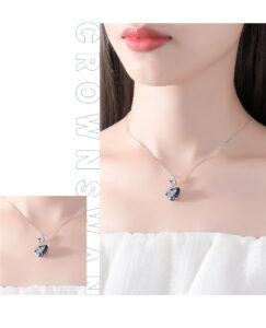 This image presents two views of the necklace on a model, highlighting its versatility. The larger view focuses on the pendant’s placement and overall styling, while the smaller inset provides a closer look at the crystal’s sparkle. The text “CROWN SWAN” reinforces the design’s identity, making it clear this piece is both a fashion statement and a conversation starter.