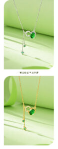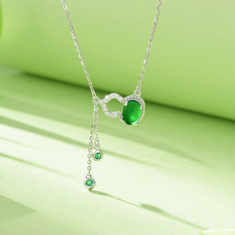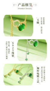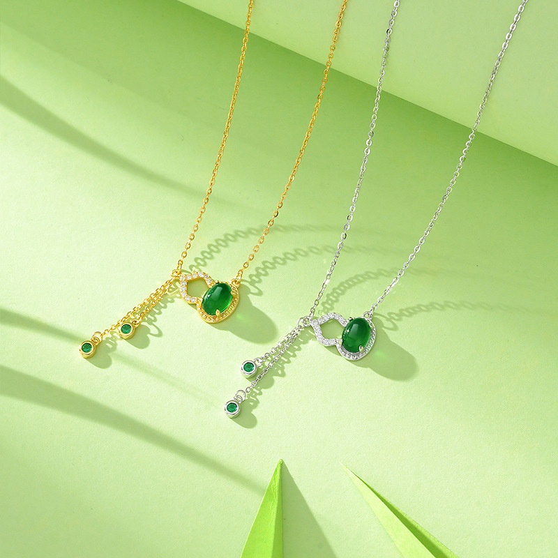 Close-up views of both color variants highlight the gourd’s intricate zircon setting, the chalcedony’s vibrant green, and the chain’s polished finish. The text (Jade Brings Blessings, Good Fortune Flows Smoothly) reinforces the necklace’s symbolic role as a luck-bringer.