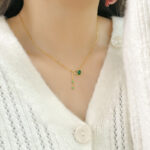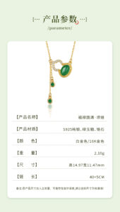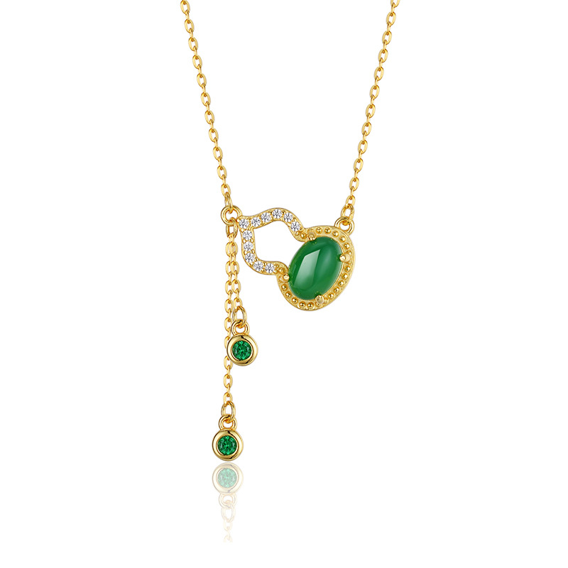 The Gourd Blessing Chalcedony Necklace by Baoyilong is showcased here, featuring a gourd-shaped pendant—a symbol of “fortune and prosperity” in Chinese culture—crafted from polished gold plating. It is adorned with a vibrant green chalcedony stone at the center, surrounded by sparkling zircon accents, and complemented by a chain with two smaller green gemstone details. Set against a soft, light green backdrop, the necklace highlights the rich green hues of the chalcedony and the warm tone of the gold plating. Key features include “S925 Silver”, “Premium Chalcedony”, and “Exquisite Polishing”. The text (Full of Blessings and Prosperity) and (Auspicious and Satisfying, Lasting Good Fortune) underscore its symbolic meaning.
