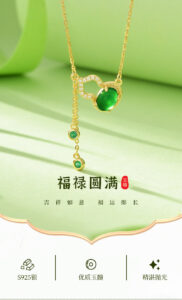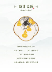 Titled “ Inspiration”, this image draws from traditional Chinese symbolism. The gourd (hulu) is a classic auspicious symbol, homophonous to (fortune) and (prosperity). The text explains: “The gourd is one of the traditional auspicious symbols, a homophone for ‘fortune and prosperity’. ‘Fortune’ implies good luck, and ‘prosperity’ implies high official rank and salary. The imperial-style silver-inlaid jade is very elegant, full of wishes for good luck and the arrival of both fortune and prosperity.” A traditional painting of gourds reinforces the cultural connection.