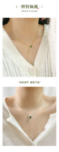 This image showcases the Gourd Blessing Chalcedony Necklace by Baoyilong. The pendant features a gourd-shaped design, a symbol of good fortune in Chinese culture, crafted from polished gold plating. It is adorned with a vibrant green chalcedony stone at the center, surrounded by sparkling zircon accents, and complemented by a chain with two smaller green gemstone details. Set against a soft, light green backdrop, the necklace highlights the rich green hues of the chalcedony and the warm tone of the gold plating. The text (Full of Blessings and Prosperity) and (Auspicious and Satisfying, Lasting Good Fortune) emphasize its symbolic meaning, making it a perfect accessory for those who appreciate jewelry that blends cultural significance with elegant design.