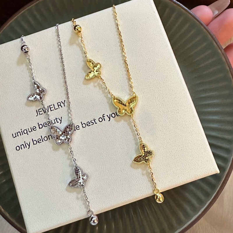 Models wear both the gold and platinum variants, showcasing their wearability. Paired with casual tops, the necklaces sit elegantly on the collarbone, with the text (Eye-Catching Details, Dazzling Yet Elegant) emphasizing their subtle glamour.