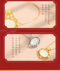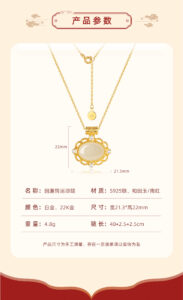 This image emphasizes the necklace’s role in “interpreting Oriental aesthetic romance, new Chinese-style design, and inheriting craftsmanship”. The Hetian Jade variant with 22K gold plating is showcased, highlighting the blend of traditional craftsmanship and modern design, ideal for those who appreciate cultural depth in jewelry.
