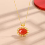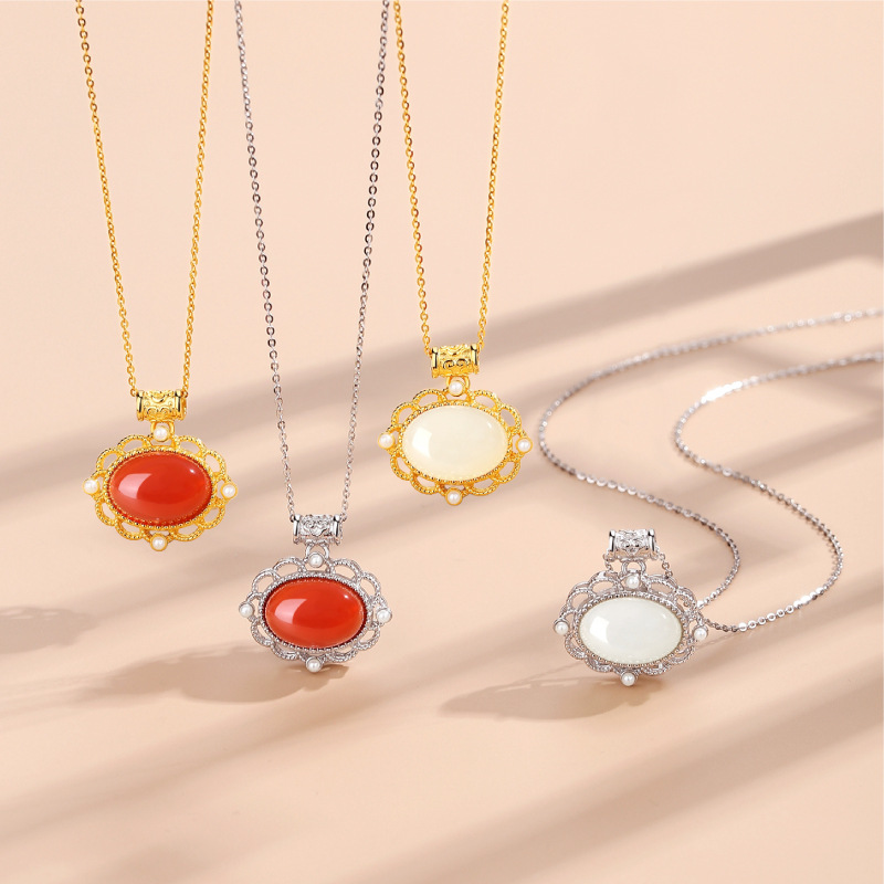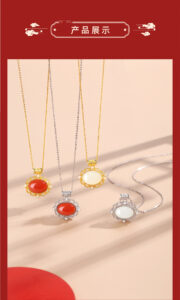 The necklace is displayed in multiple variants: South Red Agate with 22K gold plating, South Red Agate with platinum plating, Hetian Jade with 22K gold plating, and Hetian Jade with platinum plating. Set against a neutral backdrop, the image highlights the versatility in gemstones and metal finishes, catering to diverse aesthetic preferences.