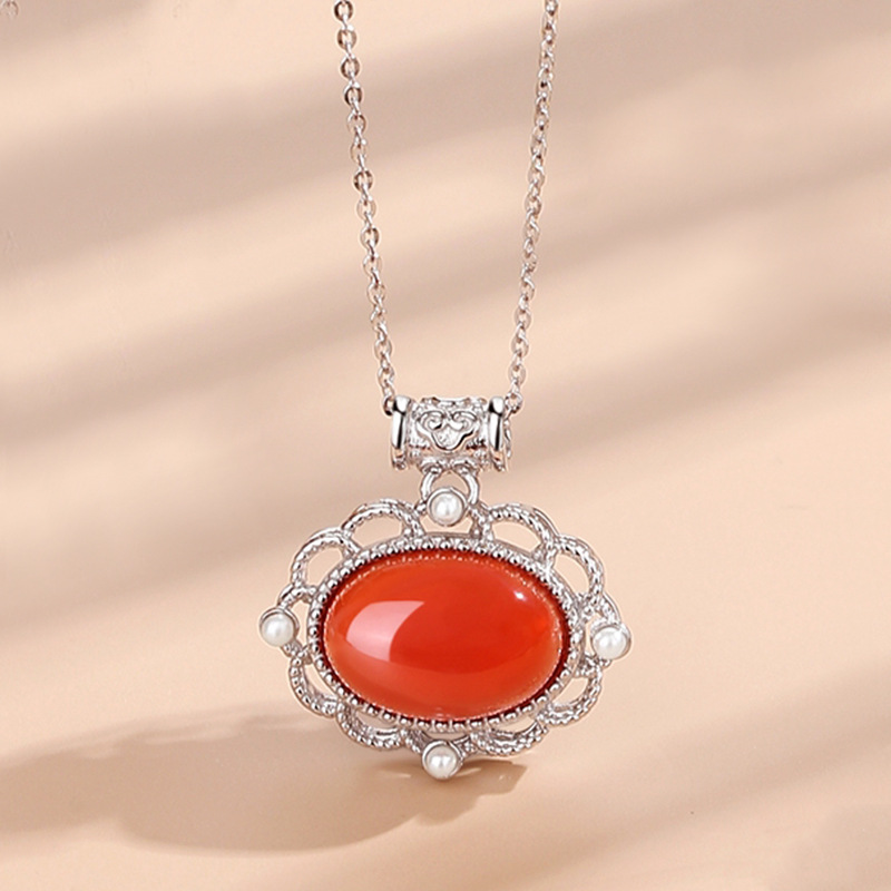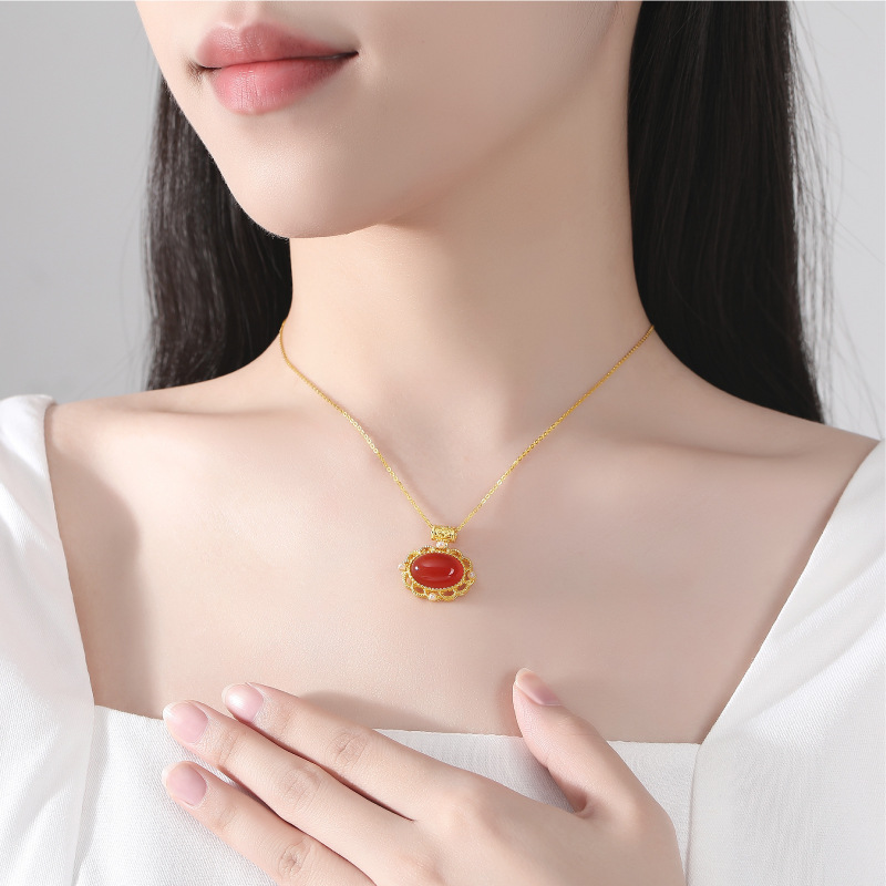 Titled “ Product Details”, this image focuses on the South Red Agate variant. The text describes its “minimalist oval shape, paired with traditional Chinese patterns, showcasing strong Chinese style when worn around the neck”. The intricate golden lace frame and pearl accents highlight the craftsmanship.