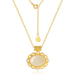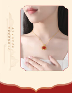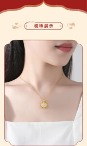 This image emphasizes the necklace’s role in “interpreting Oriental aesthetic romance, new Chinese-style design, and inheriting craftsmanship”. The Hetian Jade variant with 22K gold plating is showcased, highlighting the blend of traditional craftsmanship and modern design, ideal for those who appreciate cultural depth in jewelry.
