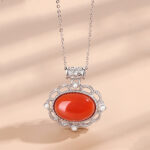 The South Red Agate variant with 22K gold plating is worn by a model, emphasizing the agate’s vibrant red hue and the necklace’s ability to add a touch of tradition to modern outfits. The text underscores the unique qualities of each gemstone.