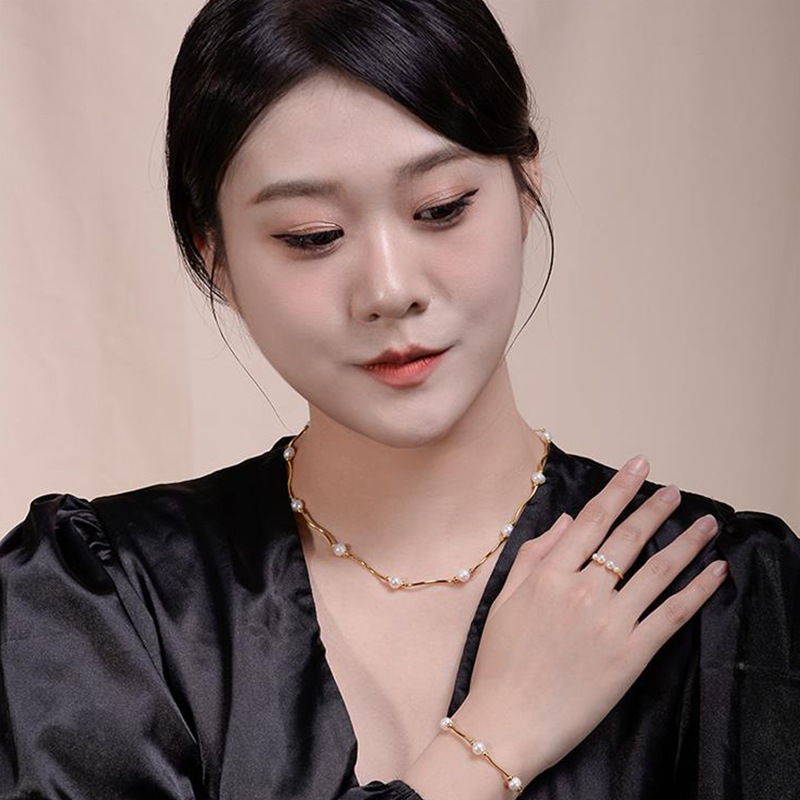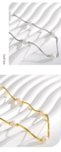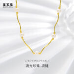 This image showcases the Flowing Pearl Gold Necklace by Baoyilong. The necklace features a series of lustrous white pearls interspersed with polished gold beads and curved gold segments, creating a fluid, elegant design. Set against a soft, light-colored backdrop with gentle light patterns, the necklace embodies a blend of classic pearl beauty and modern, minimalist gold styling. The text “(FLOWING PEARL)” and highlight its theme of flowing elegance, making it a versatile accessory that balances timeless sophistication with contemporary charm. Ideal for those who appreciate jewelry that merges natural pearls with refined gold detailing, this necklace adds a touch of grace to any ensemble.
