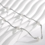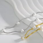 Close-up views of both color variants emphasize the pearls’ luster, the metal’s polished finish, and the fluid design of the chain. The light, airy backdrop draws attention to the necklace’s craftsmanship and elegant proportions.