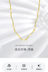 This image showcases the Flowing Pearl Gold Necklace by Baoyilong. The necklace features lustrous natural pearls interspersed with polished gold segments and beads, creating a fluid, elegant design. Set against a soft, light-colored backdrop, the necklace highlights its key materials: S925 Sterling Silver, Natural Pearls, and Exquisite Polishing. The text “(FLOWING PEARL)” and emphasize its theme of flowing elegance, merging classic pearl beauty with modern gold styling.
