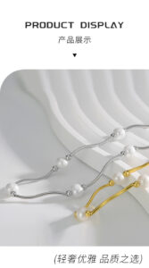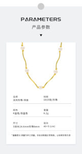 A model wears the necklace, showcasing its placement on the collarbone. Paired with a black satin top, the necklace’s blend of pearls and gold adds a touch of refined glamour, with the text (Outstanding appearance, making people fall in love at first sight) reinforcing its visual impact.
