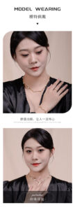 Titled (Wearing Occasions), this image outlines the necklace’s versatility. The text (Matching Occasions) notes: “Classic style suitable for various occasions: home, workplace, dating, weddings, etc.” Visuals of the necklace paired with different looks reinforce its adaptability.