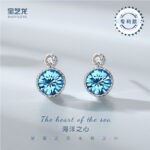 The Heart of the Sea Earrings by Baoyilong are showcased here, featuring a striking design with large, round blue cubic zirconia stones set in polished sterling silver. Each earring is accented with a smaller sparkling stone at the top, enhancing their elegant appeal. Displayed against a soft, light backdrop, the earrings exude timeless romance. The text “The heart of the sea” and  (Heart of the Sea), along with  (Deep Sea Love, Eternal Heart), emphasize their symbolic meaning of enduring love.