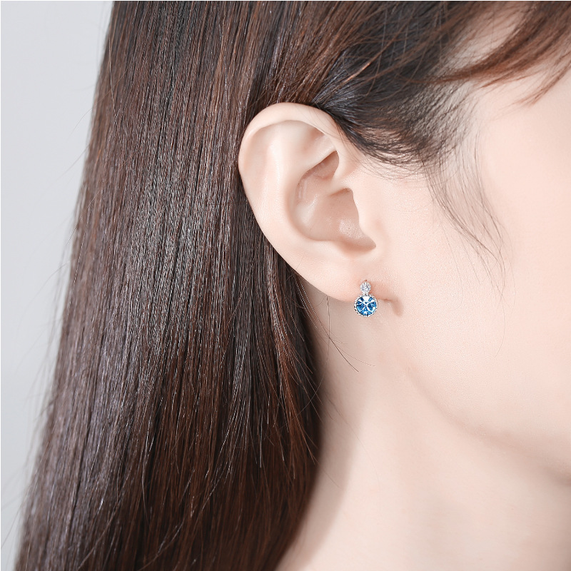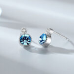 A model wears the ocean blue variant, showcasing the earrings’ placement on the ear. The design’s sparkle and elegant proportions are emphasized, highlighting how they complement different hairstyles and add a touch of sophistication to any look.