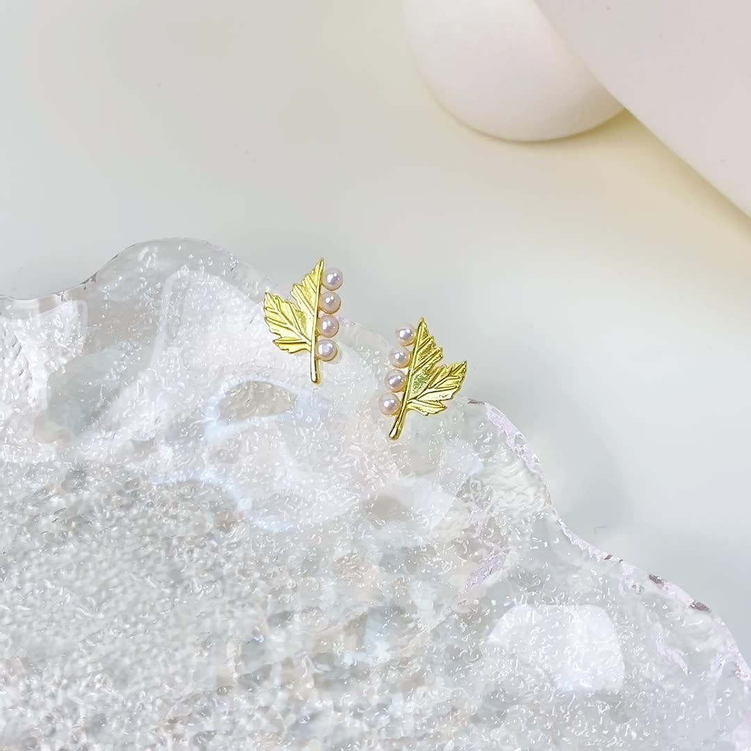 This image showcases the Golden Leaf Pearl Earrings, featuring a delicate design with golden leaf motifs adorned with tiny, lustrous pearls. Crafted with attention to detail, the earrings blend nature-inspired elegance with timeless charm. Displayed on a textured, translucent surface against a soft, light backdrop, they exude a sense of subtle sophistication and whimsical beauty. Perfect for those who appreciate jewelry that captures the essence of nature, these earrings are versatile enough for everyday wear or to add a touch of grace to special occasions, making them a lovely addition to any jewelry collection.