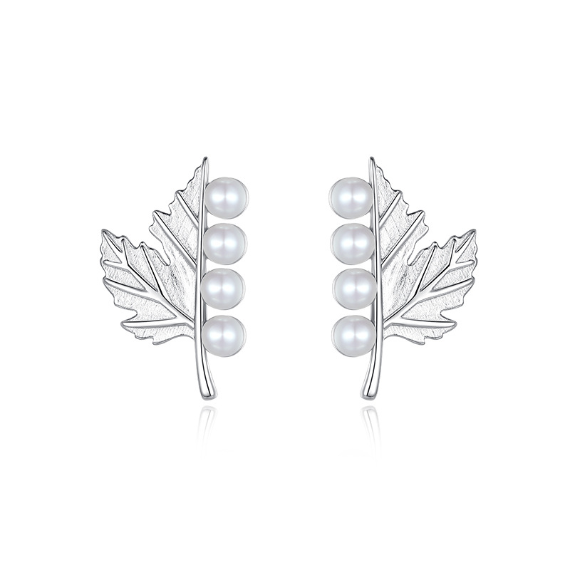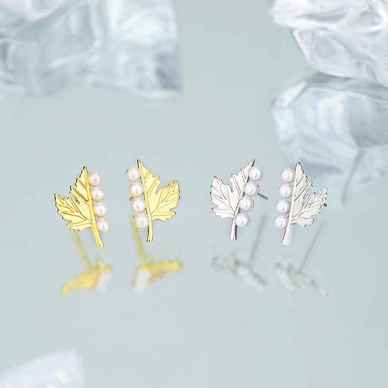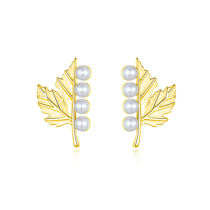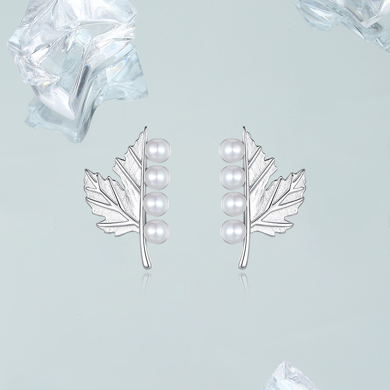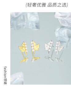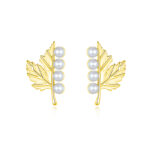 Both gold and platinum variants of the earrings are displayed, showcasing the design’s versatility across metal finishes. The intricate maple leaf detailing and pearl accents are highlighted, with the text (Fashion Necklace) underscoring the collection’s stylish, contemporary appeal.
