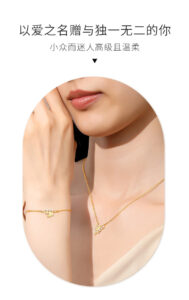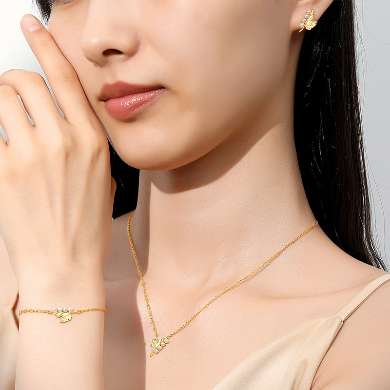A model wears the gold variant of the collection, featuring a necklace, bracelet, and earrings. The set’s cohesive maple leaf design and pearl detailing are highlighted, emphasizing its ability to add a touch of refined elegance to any look. The text (Given to the unique you in the name of love) and (Niche and charming, high-end and gentle) reinforce its appeal as a sophisticated, sentimental gift.