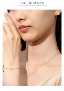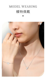 A model wears the platinum variant, showcasing how the earrings, necklace, and bracelet complement each other. The design’s subtle sparkle and elegant proportions are highlighted, making it suitable for both everyday wear and special occasions.