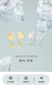 This image showcases the Maple Leaf Pearl Jewelry Collection by Baoyilong, featuring earrings in both gold and platinum finishes. The design centers on intricate maple leaf motifs adorned with lustrous pearls, crafted from S925 sterling silver. Set against a soft, light backdrop with translucent accents, the pieces exude nature-inspired elegance. Key materials are highlighted: S925 Sterling Silver (skin-friendly, hypoallergenic), Premium Pearls (lustrous, durable), and Exquisite Polishing (ensuring a flawless finish). The text “(MAPLE LEAVES)” and (Maple Leaf Bracelet) emphasize the collection’s thematic inspiration from autumn foliage.