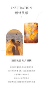 Titled (Design Inspiration), this image draws from the romance of maple leaves and the song “Maple” by Jay Chou. The design embodies “Maple leaves color stories, and longing conveys love”, with the timeless maple leaf shape “carrying lovers’ endless yearning, capturing the romance and longing beyond sweetness in relationships”. Visuals of maple leaves and a romantic seaside scene reinforce the connection to love, nature, and enduring sentiment.