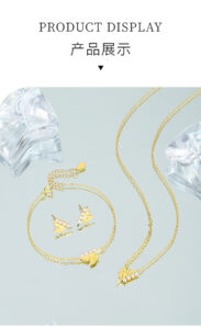 The gold-colored collection—including earrings, a bracelet, and a necklace—is displayed in its entirety. Set against a light backdrop with translucent accents, the pieces’ craftsmanship and thematic coherence are emphasized, with the text and (Light Luxury Elegance, Quality Choice) highlighting their status as high-end accessories.
