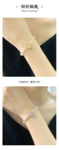 The bracelet is shown in two scenarios: a model wearing it with a white blouse, and hands adorned with the bracelet while holding flowers. The text states: the classic style suits various occasions, including home, workplace, dating, and weddings. The “Simple and fresh” aesthetic makes it a versatile accessory that complements both casual and formal looks.