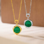 The Moebius Strip Malachite Necklace is displayed in both gold and silver finishes, emphasizing their contrasting aesthetics. The gold version offers a warm, luxurious look, while the silver version provides a sleek, modern appeal. Set against a neutral backdrop, the necklaces highlight the malachite’s vibrant green and the metal’s polished finish, showcasing their versatility and design cohesion.