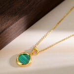 This image features two elegant necklaces centered around malachite pendants, showcasing a striking contrast between gold and silver tones. The left necklace boasts a gold-toned finish, with a uniquely twisted pendant encasing a vibrant green malachite stone, paired with a delicate gold chain. The right necklace features a silver-toned design, with a similarly twisted malachite pendant and a sleek silver chain. Set against a warm, neutral backdrop, the necklaces highlight the malachite’s distinctive striped pattern and the metal’s polished sheen. Combining natural gemstone beauty with modern, sculptural design, these pieces are ideal for those who appreciate jewelry that merges earthy elegance with contemporary style.