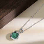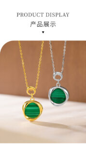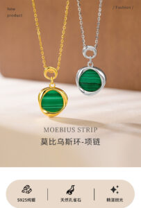 This image introduces the Moebius Strip Malachite Necklace, available in two finishes: gold and silver. Each necklace features a uniquely twisted pendant encasing a vibrant green malachite stone, symbolizing the infinite loop of the Moebius strip. Crafted from S925 silver, with exquisite polishing and natural malachite, the necklaces blend modern design with earthy elegance. The warm, neutral backdrop highlights the malachite’s distinctive striped pattern and the metal’s polished sheen, making it a standout piece for those who appreciate contemporary jewelry with symbolic depth.