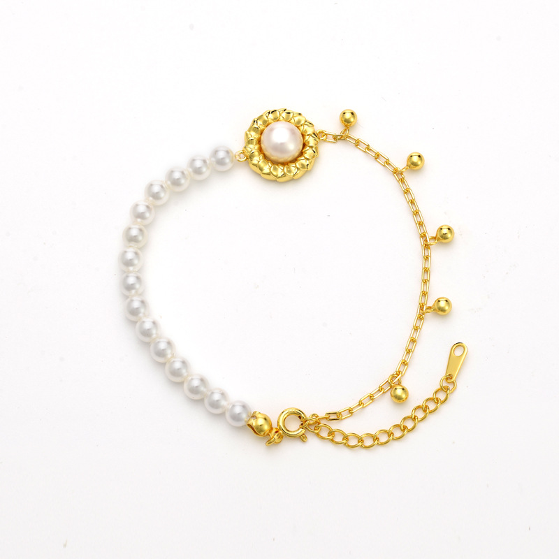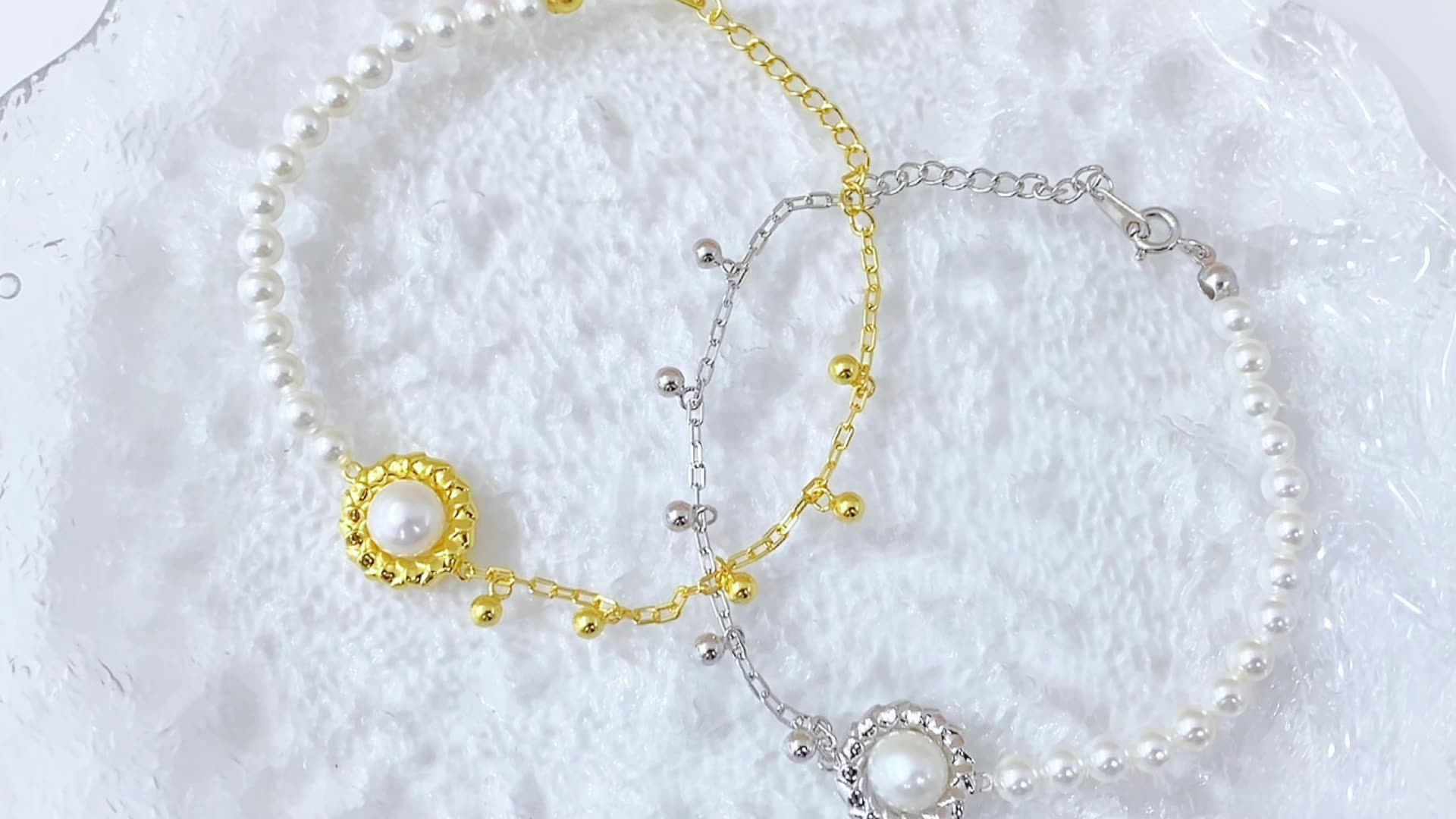 This image features two elegant bracelets centered around pearl and sunburst motifs, presented in gold and silver tones. The gold bracelet showcases a luminous pearl encased in an ornate sunburst charm, paired with a strand of white pearls and delicate gold beads. The silver version mirrors this design, with a silver sunburst charm, pearl strand, and silver beads. Set against a textured white backdrop, the bracelets highlight the contrast between the pearls’ soft luster and the metals’ polished sheen. Blending classic pearl elegance with a whimsical sunburst design, these pieces are ideal for those who appreciate jewelry that merges timeless sophistication with playful detailing.