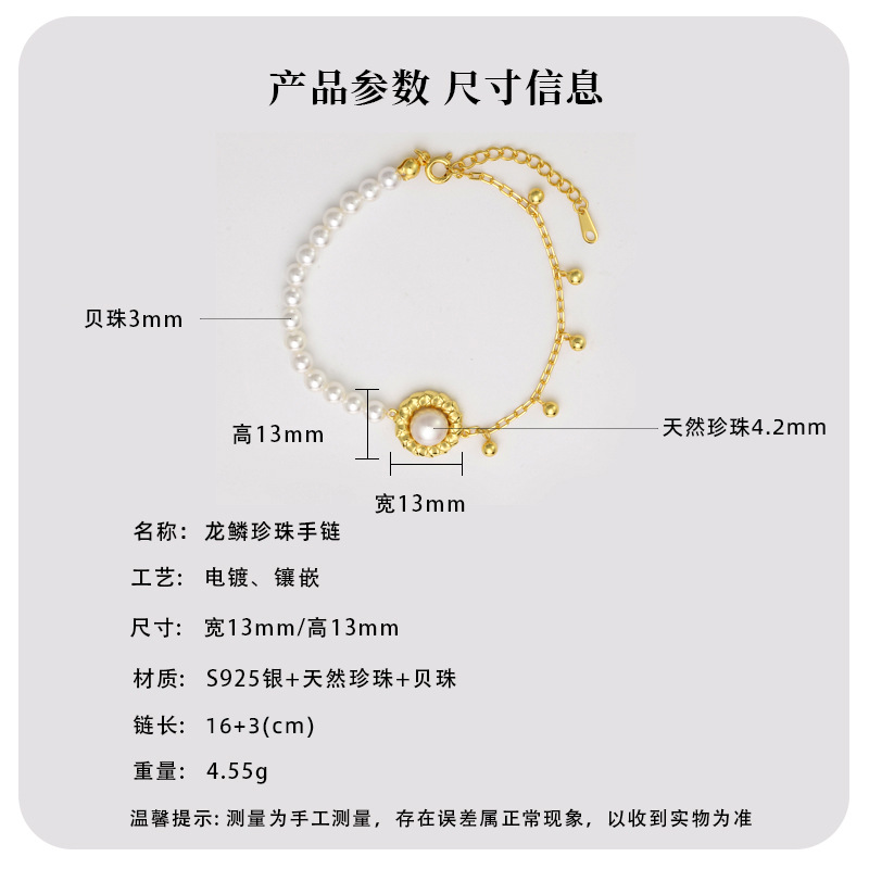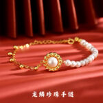 This image features the Dragon Scale Pearl Bracelet in a gold-toned finish. The bracelet combines a strand of white pearls with a gold chain section, centered around a prominent pearl encased in an intricately designed dragon scale-inspired charm. Set against a rich red backdrop, the piece exudes luxury and cultural significance, with the Chinese name highlighting its fusion of traditional dragon symbolism and timeless pearl elegance.