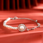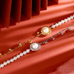 The Dragon Scale Pearl Bracelet is displayed in both gold and silver finishes, emphasizing their contrasting aesthetics. The gold version offers a warm, luxurious look, while the silver version provides a sleek, modern appeal. Set against a red backdrop, the bracelets highlight the pearls’ soft luster and the metals’ polished sheen, showcasing their versatility and design cohesion.